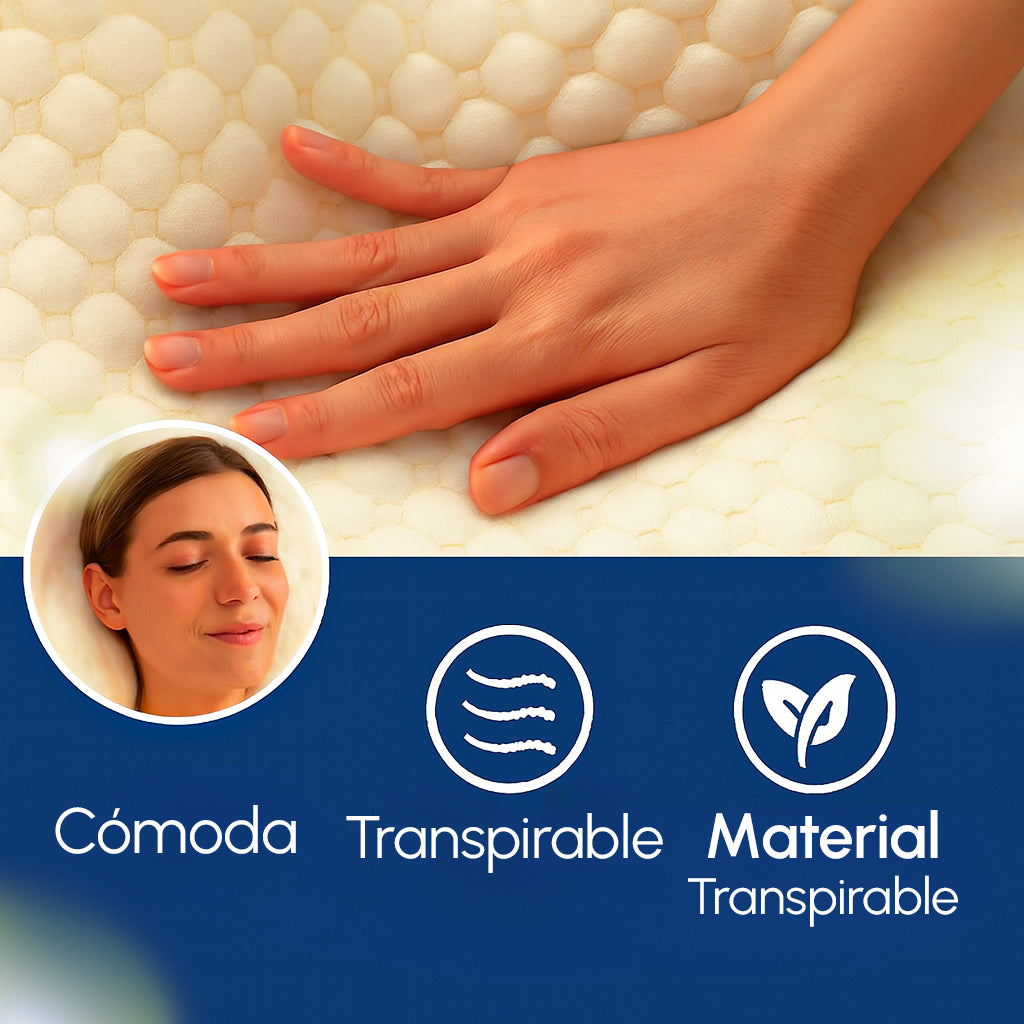 Nuestra almohada ortopédica viscoelástica está diseñada para mantener el cuello y la columna correctamente alineados durante toda la noche. Gracias a su núcleo de espuma memory foam de alta densidad, se adapta a la forma natural del cuello y la cabeza, reduciendo la presión en la zona cervical y favoreciendo la relajación muscular. El resultado es un descanso más profundo, continuo y sin interrupciones causadas por el dolor cervical.